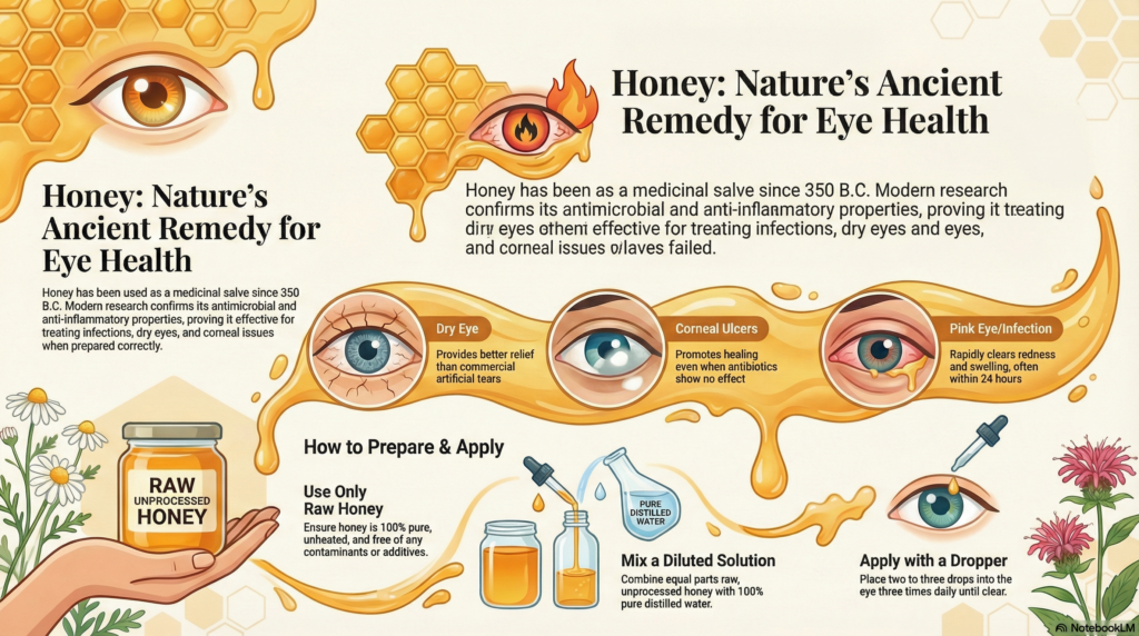 Actually, does honey really sound that terrible as an eye cure when most of us would so readily put chemical laden synthetic eye drop dispensed by the pharmacies to treat eye infection?