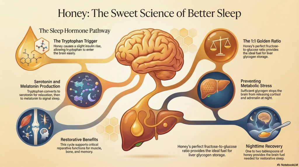 Unlike processed sugars, eating honey raises blood sugar level only slightly. The controlled rise of insulin causes the tryptophan to enter our brain and get converted into serotonin. And in darkness, serotonin is converted into melatonin, a well-known cure for sleeping disorders.